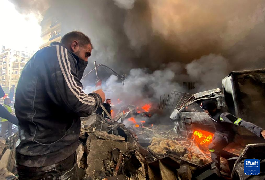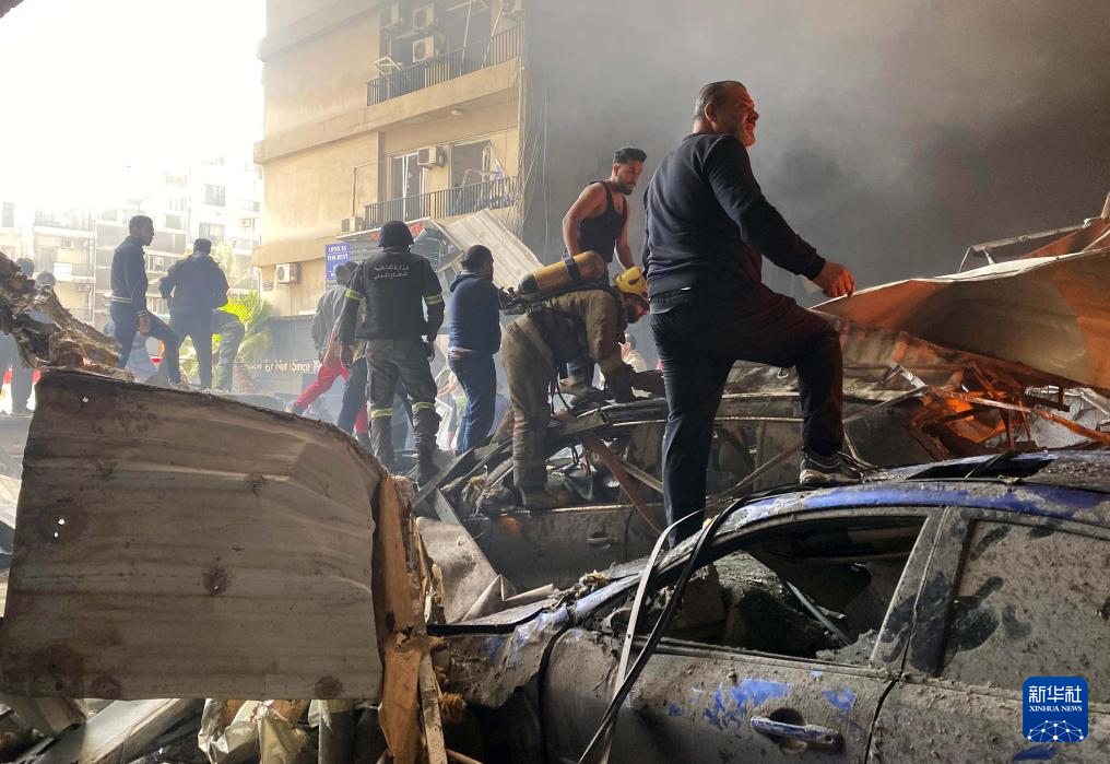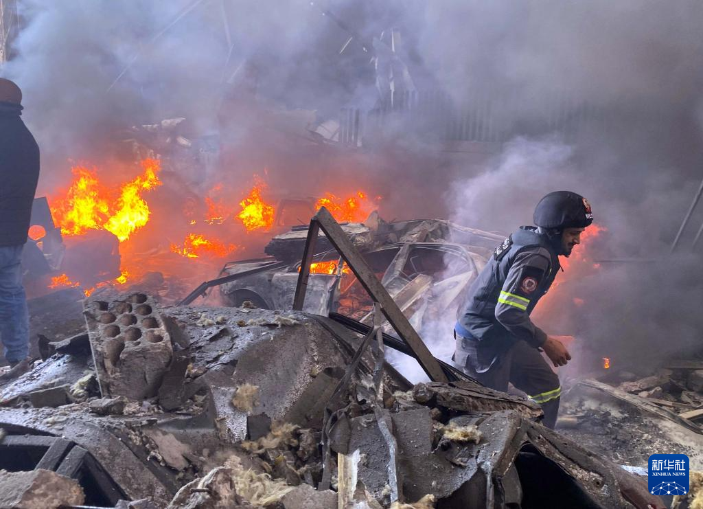4月8日,救援人员在黎巴嫩首都贝鲁特扑救以色列空袭引发的火灾(手机照片)。