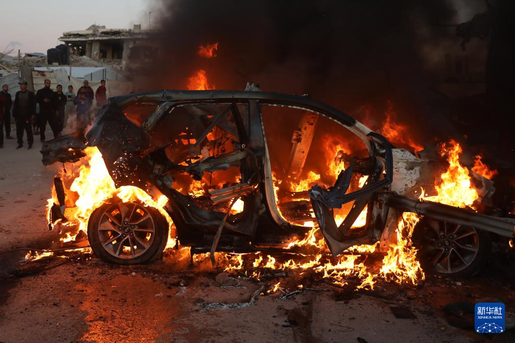 这是4月8日在加沙城拍摄的遭以军空袭后起火的车辆,车内一名半岛电视台记者遇难。新华社发(里泽克·阿卜杜勒贾瓦德摄)