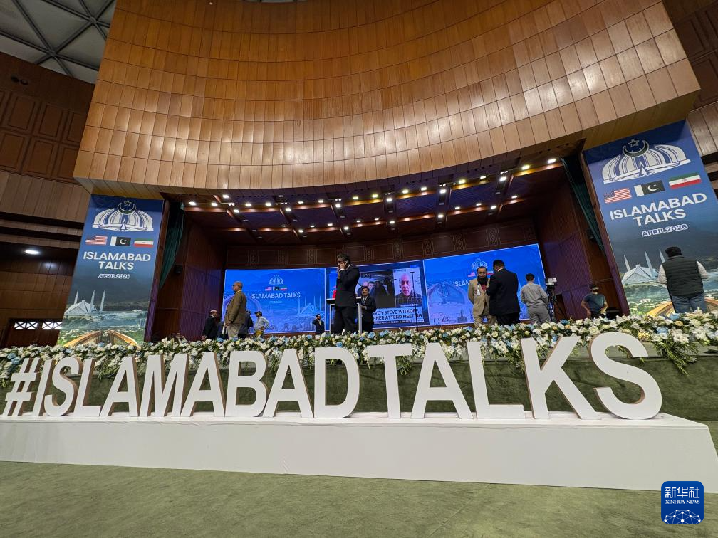 这是4月11日在巴基斯坦首都伊斯兰堡拍摄的美伊谈判新闻中心。新华社发(王申 摄)