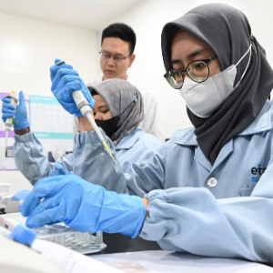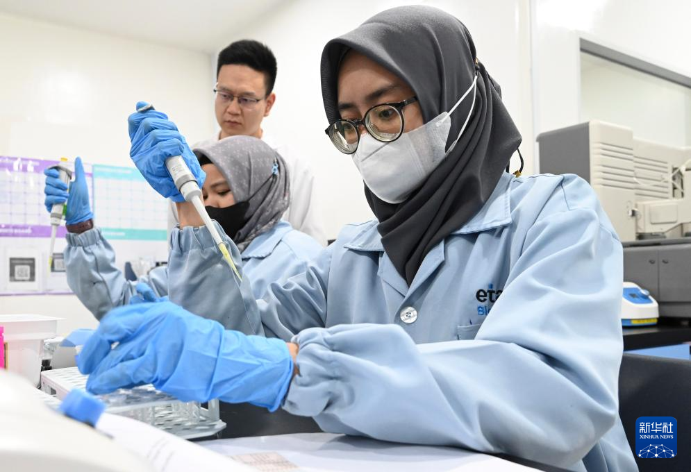 4月10日,技术人员在印度尼西亚雅加达的印尼埃塔纳生物技术公司工作。新华社发(祖卡南摄)