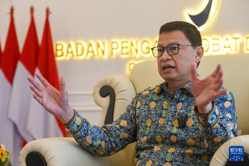 4月10日,在印度尼西亚雅加达,印尼食品与药品管理局局长塔鲁纳·伊克拉尔接受新华社记者采访。新华社发(祖卡南摄)
