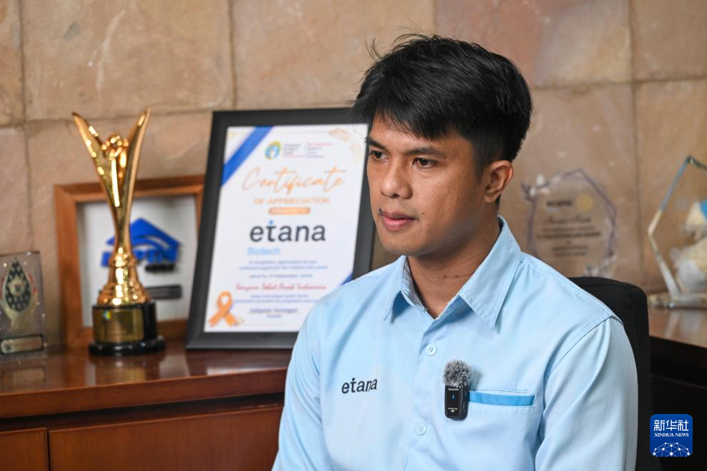 4月10日,在印度尼西亚雅加达,印尼埃塔纳生物技术公司生产主管维诺接受新华社记者采访。新华社发(祖卡南摄)