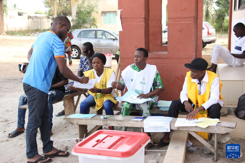 4月12日,在贝宁维达市一处投票站,工作人员核对选民信息。