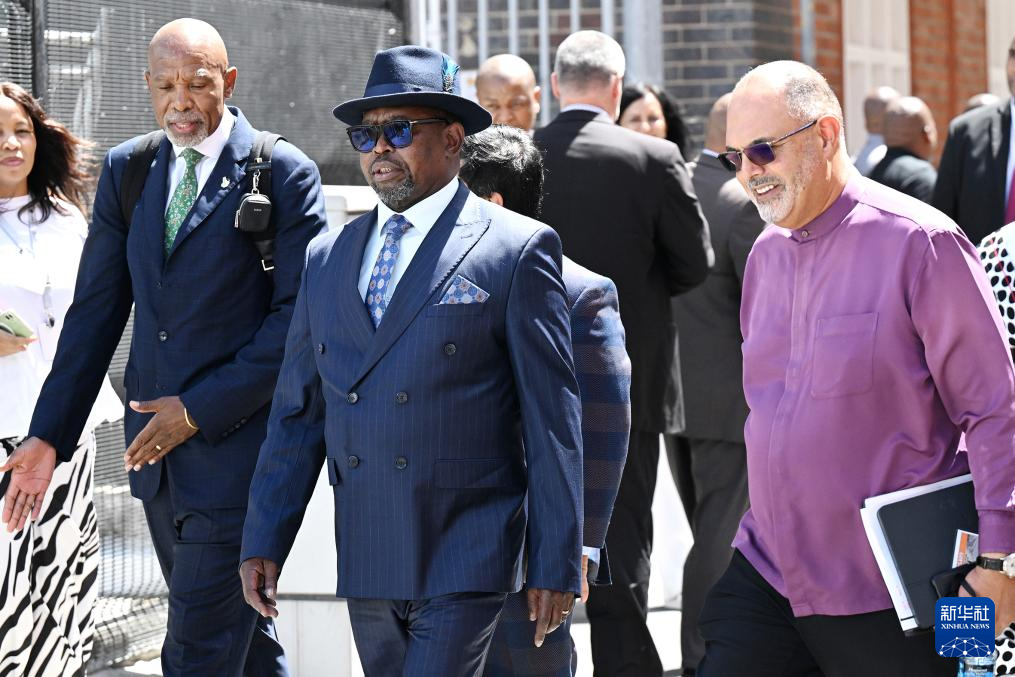 这是2月25日南非财政部长埃诺赫·戈东瓜纳(前中)在开普敦准备出席南非议会会议的资料照片。新华社发(哈比索·姆卡贝拉摄)