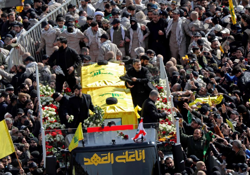 2025年2月23日,在黎巴嫩贝鲁特,真主党支持者参加真主党前领导人纳斯鲁拉和萨菲丁的葬礼。新华社发(比拉尔·贾维希摄)