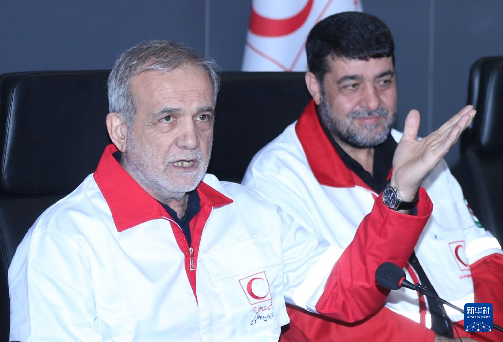 4月15日,伊朗总统佩泽希齐扬(左)在首都德黑兰视察伊朗红新月会时发表讲话。新华社记者 沙达提 摄