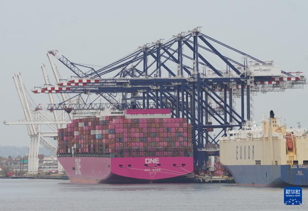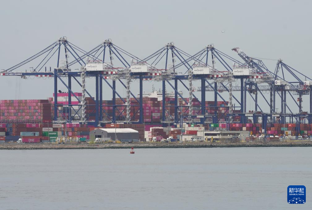 这是4月15日在美国纽约拍摄的纽约和新泽西港一个集装箱码头。纽约和新泽西港是美国东北部最大的贸易和货物进出口中心。