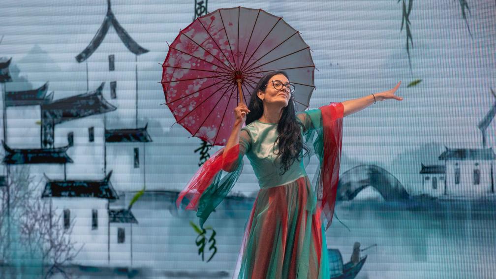 4月16日,在塞尔维亚尼什举行的中文大赛上,选手表演舞蹈。新华社发(王韡摄)