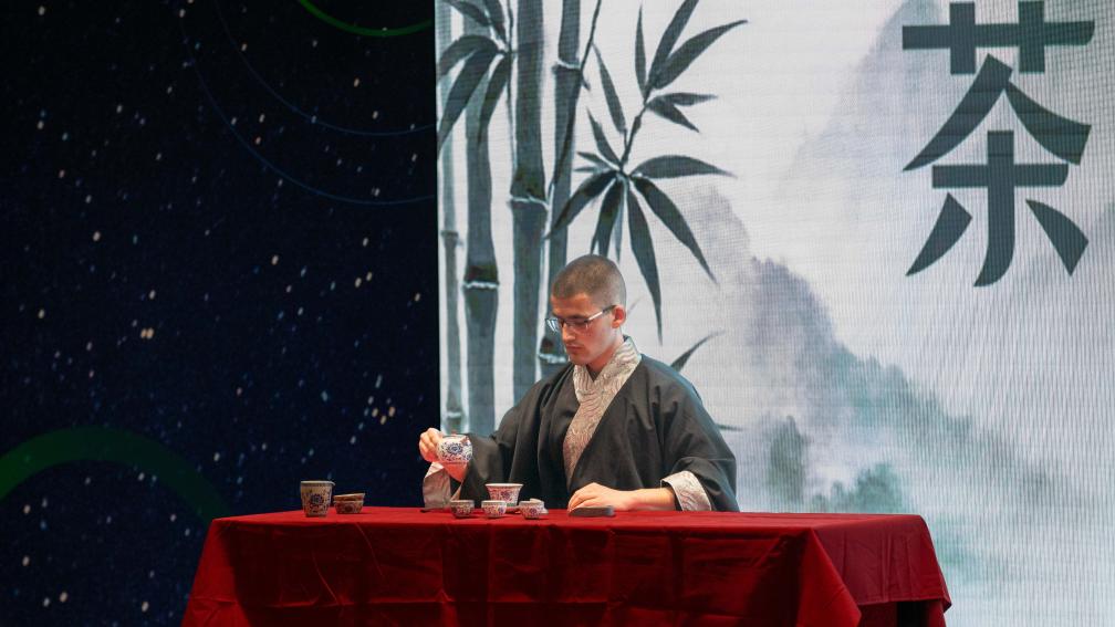4月16日,在塞尔维亚尼什举行的中文大赛上,选手展示中国茶艺。新华社发(王韡摄)