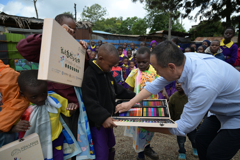 4月18日,在肯尼亚内罗毕一所贫民社区学校举行的2026“我是自然小伙伴”儿童画国际巡展“绘画温暖童心”公益捐赠活动现场,中国儿童画国际巡展组委会主席孔繁纲向当地社区儿童赠送画笔。记者 杨光 摄