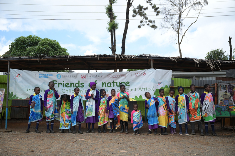 4月18日,在肯尼亚内罗毕一所贫民社区学校举行的2026“我是自然小伙伴”儿童画国际巡展现场,当地孩子们穿着印着儿童画的丝巾参加活动。记者 杨光 摄