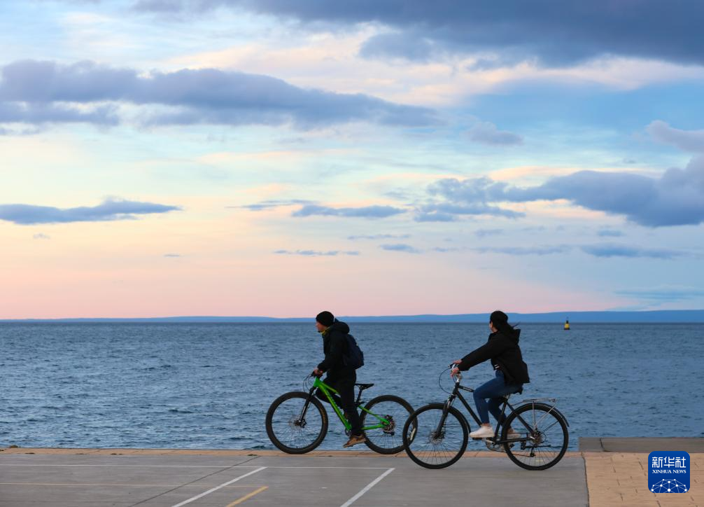 4月20日,人们在智利南部蓬塔阿雷纳斯海边骑行。
