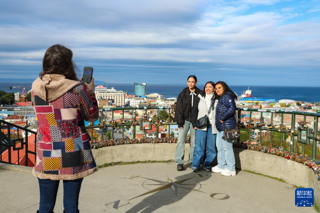 4月19日,人们在智利南部蓬塔阿雷纳斯一处观景台留影。