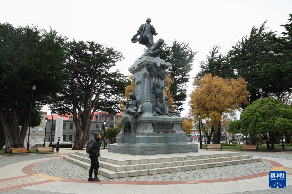 4月19日,在智利南部蓬塔阿雷纳斯,一名男子经过武器广场上的麦哲伦纪念碑。