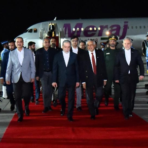 4月24日晚,伊朗外长阿拉格齐(中)率领的代表团抵达巴基斯坦首都伊斯兰堡。巴副总理兼外长达尔、陆军参谋长穆尼尔等高级官员到场迎接。新华社发