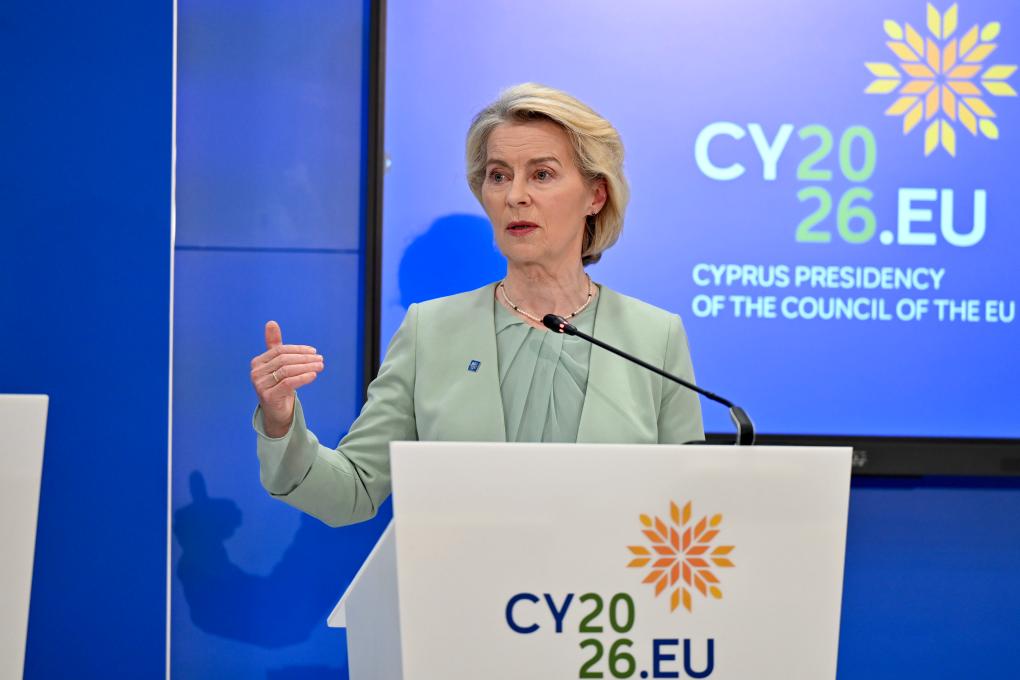 4月24日,在塞浦路斯首都尼科西亚,参加欧盟领导人非正式会议的欧盟委员会主席冯德莱恩会后出席新闻发布会。新华社记者吕优摄