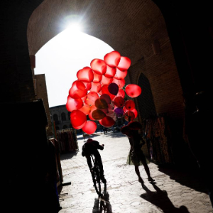 4月24日,一名卖气球的女孩走在乌兹别克斯坦布哈拉古城内。