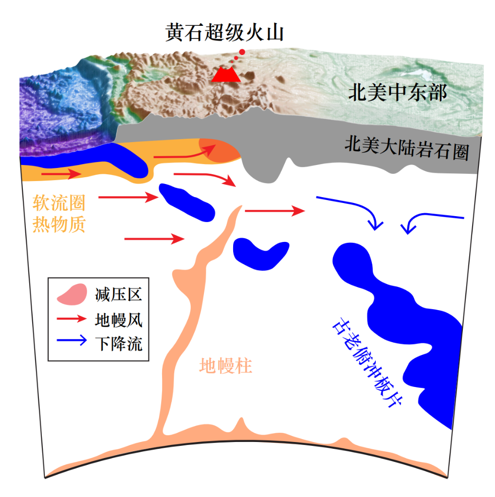 图示为北美下方复杂的地幔流场和驱动机制。古老俯冲板片驱动的东向“地幔风”,在黄石下方形成了减压熔融区。这一发现揭示了黄石超级火山形成的新机制。(作者供图)