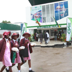 4月23日,在津巴布韦布拉瓦约举行的第66届津巴布韦国际贸易博览会上,人们经过莫桑比克展馆。新华社发(塔法拉摄)