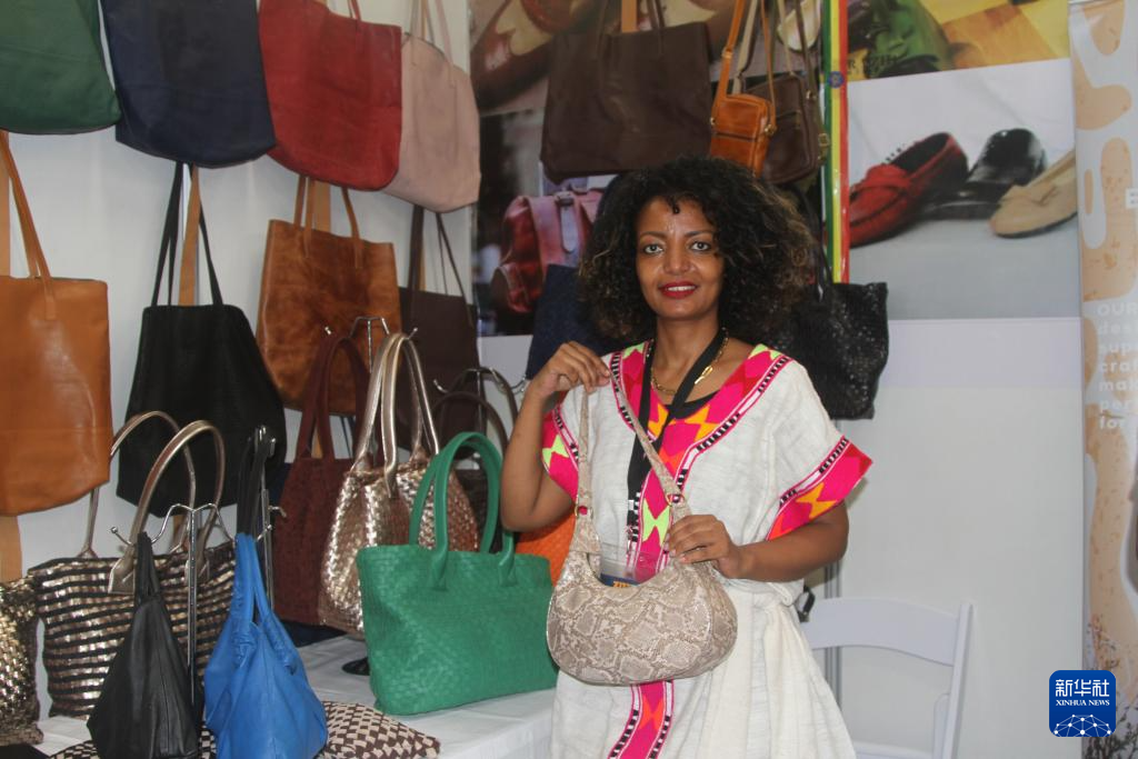 4月23日,在津巴布韦布拉瓦约举行的第66届津巴布韦国际贸易博览会上,一名埃塞俄比亚参展商展示皮革制品。新华社发(塔法拉摄)