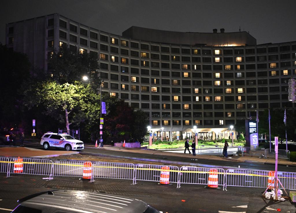 4月25日,举行白宫记者协会晚宴的美国华盛顿希尔顿酒店前拉起路障。新华社记者李睿摄