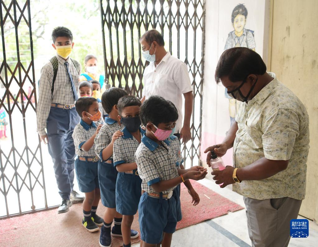10月28日,在印度阿加尔塔拉,孩子们进入幼儿园前为手消毒。