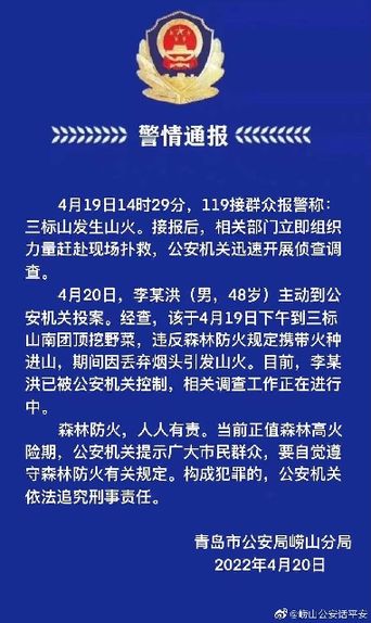 4月20日下午,青岛市公安局崂山分局发布通报称,4月20日,李某洪(男,48岁)主动到公安机关投案。