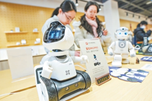 在智能产品区,一台陪伴机器人主动与顾客打招呼。(武亦彬 摄)